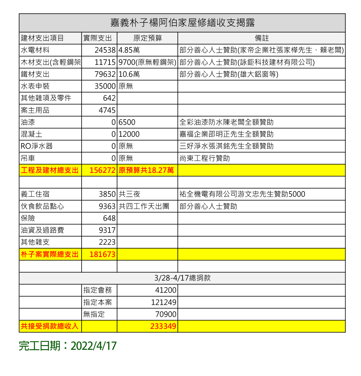 義工們能為弱勢家庭修築房子,全需捐贈人的大力支持,謝謝所有捐贈人和我們一起幫忙朴子楊阿伯,給他從此住在不必擔心受怕屋頂會塌陷的屋子裡。